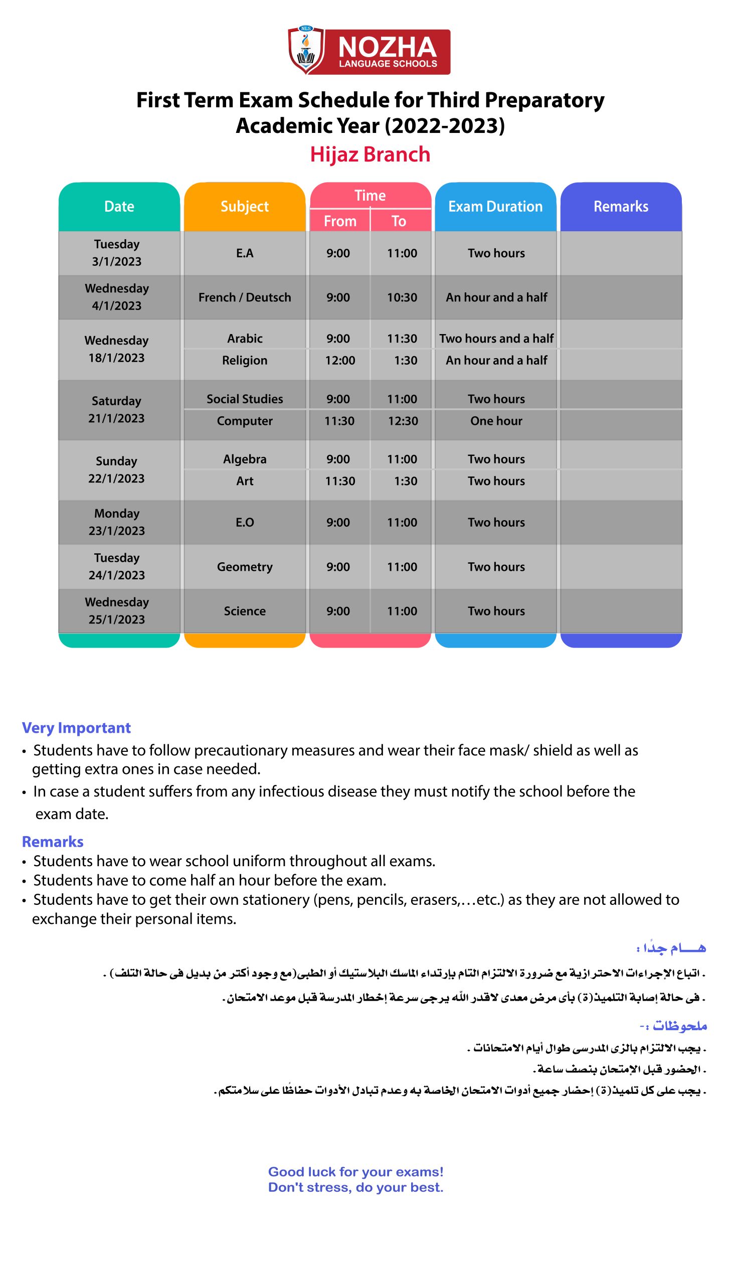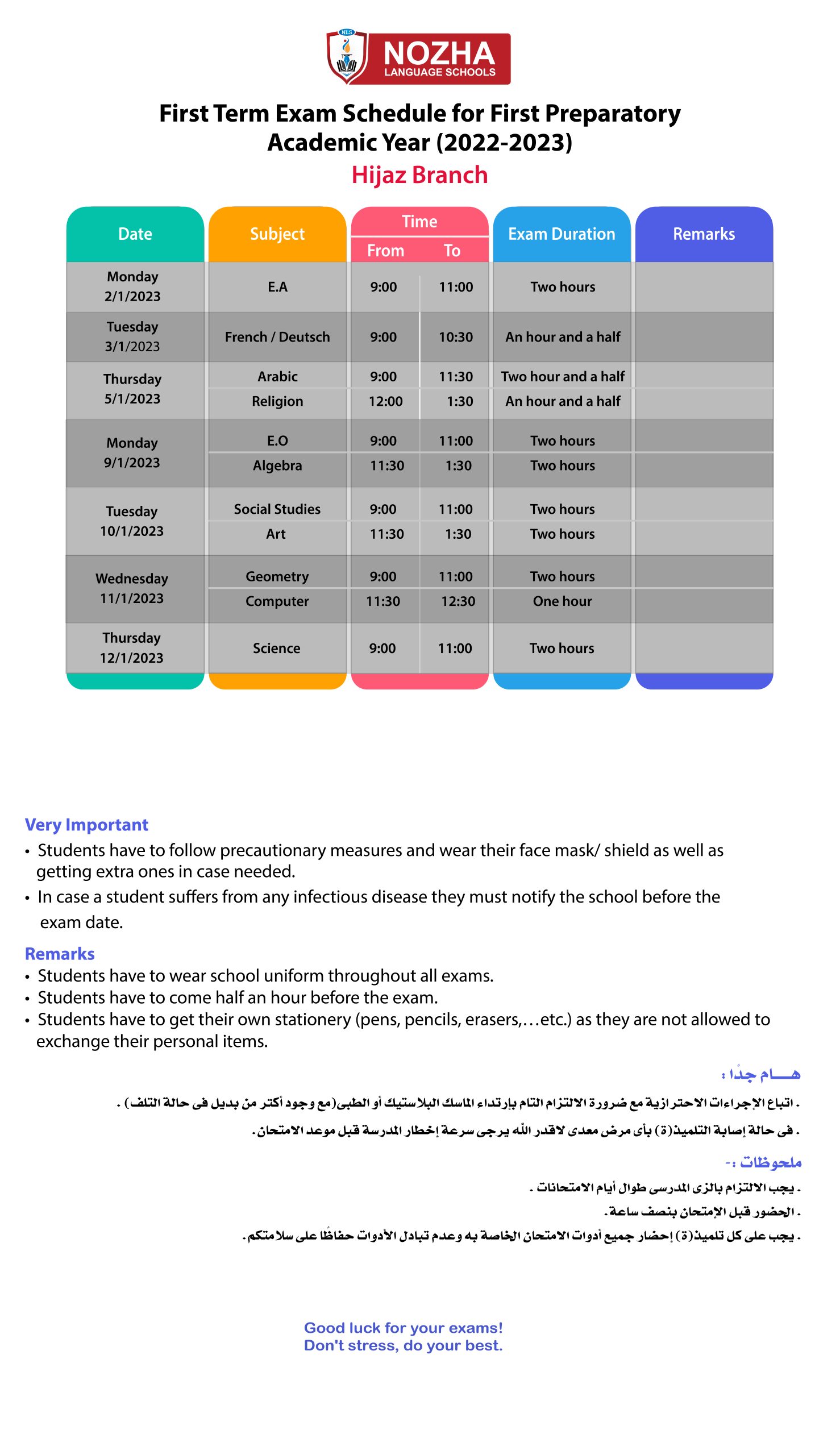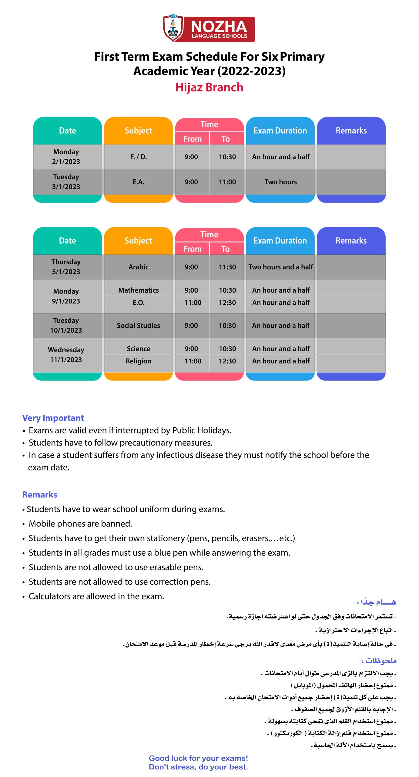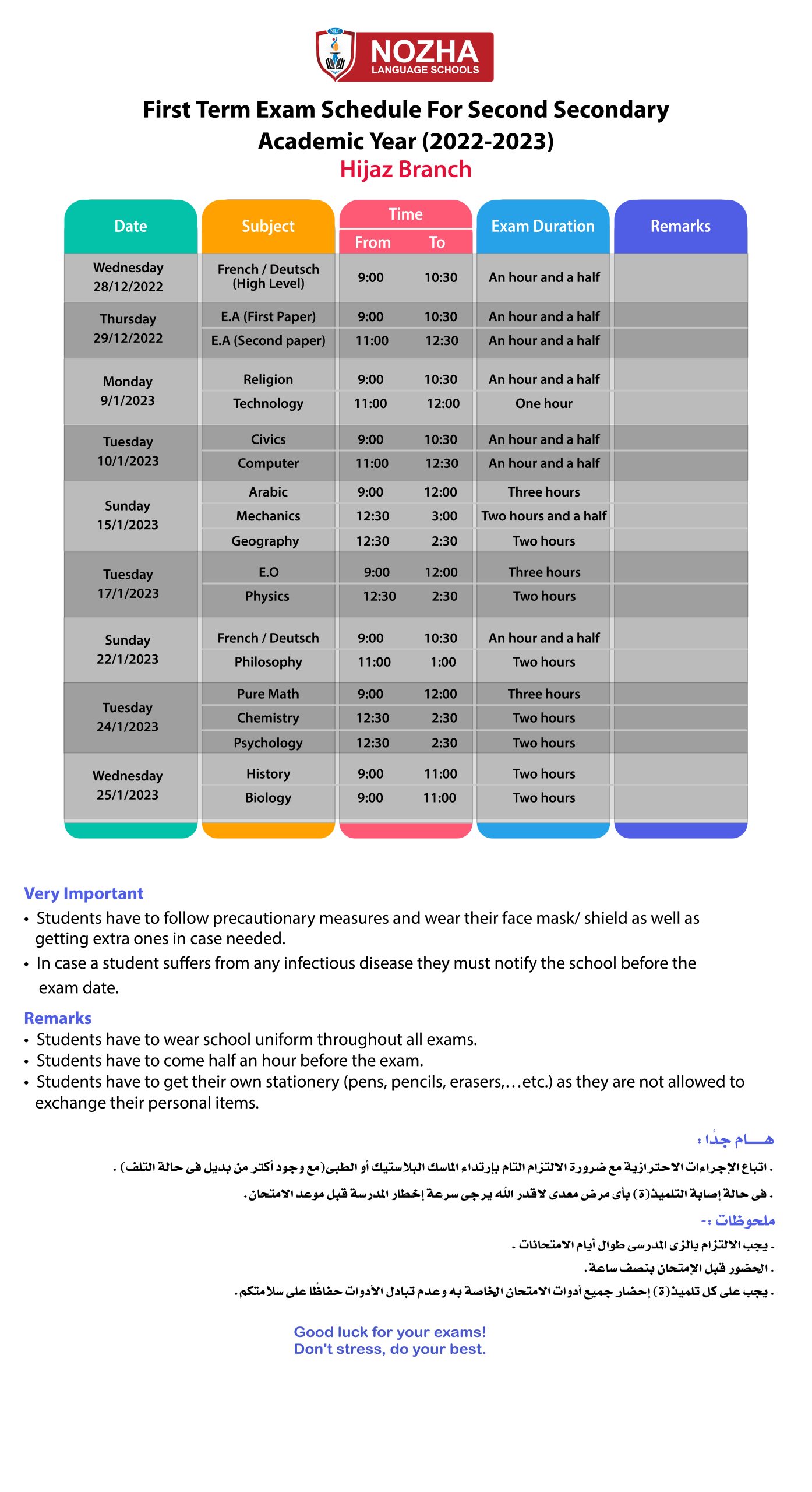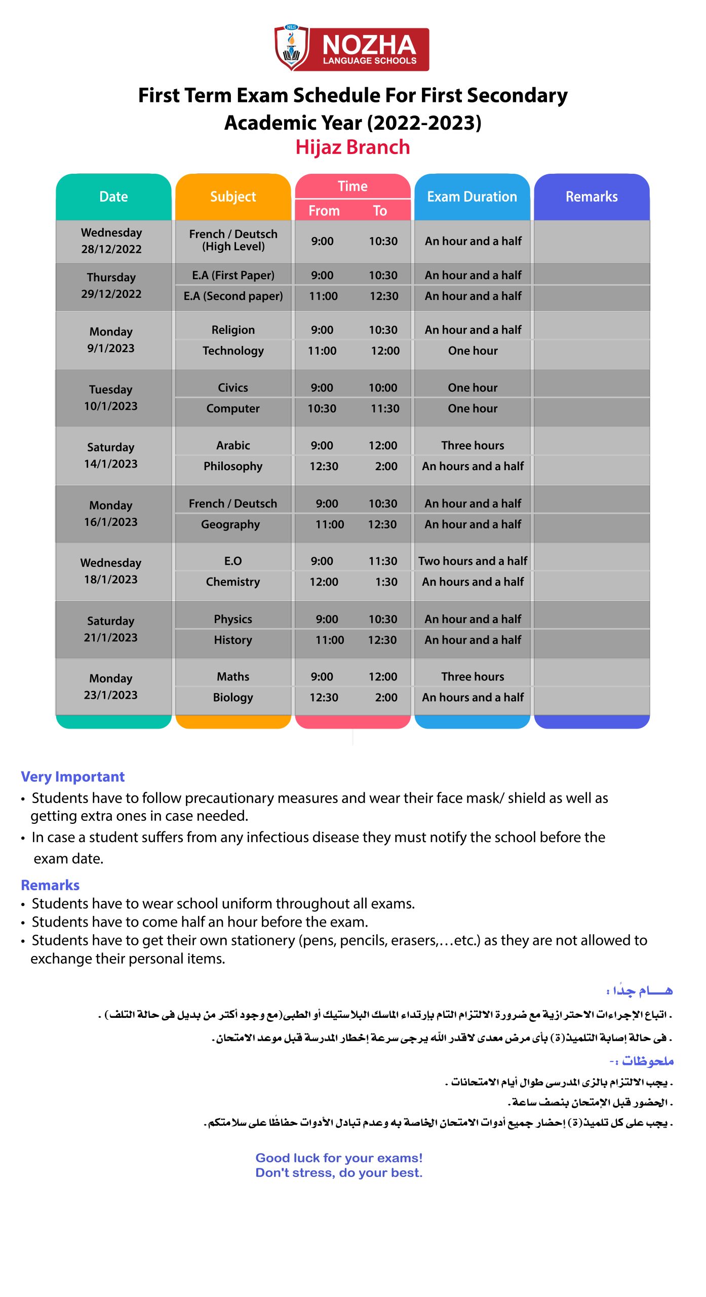 جدول امتحانات الفصل الدراسي الأول 2022-2023 Khaled2022-12-28T10:47:42+02:00 Share This Story, Choose Your Platform! FacebookXRedditLinkedInWhatsAppTumblrPinterestVkXingEmail