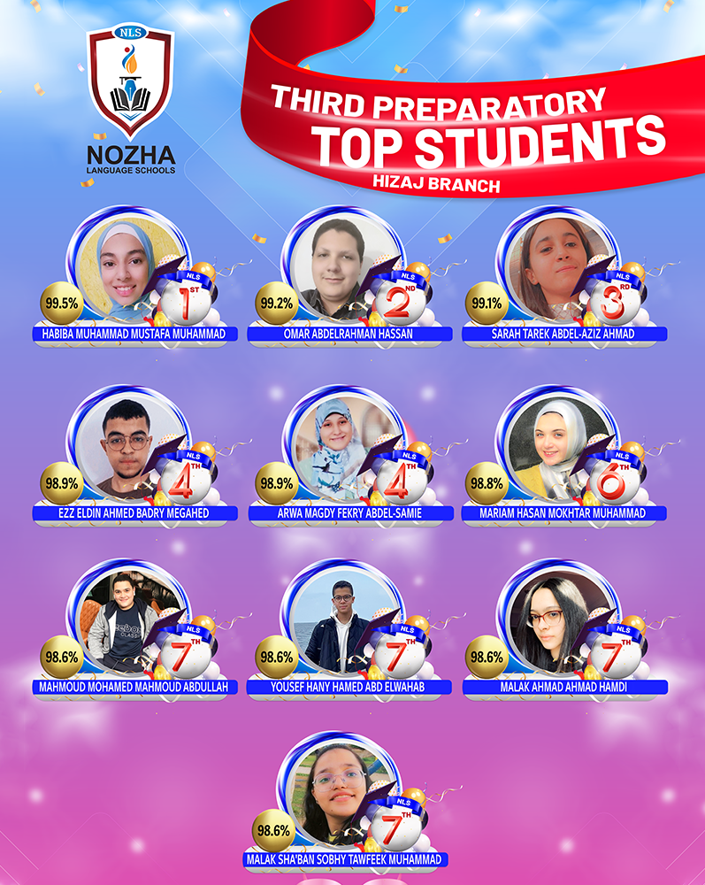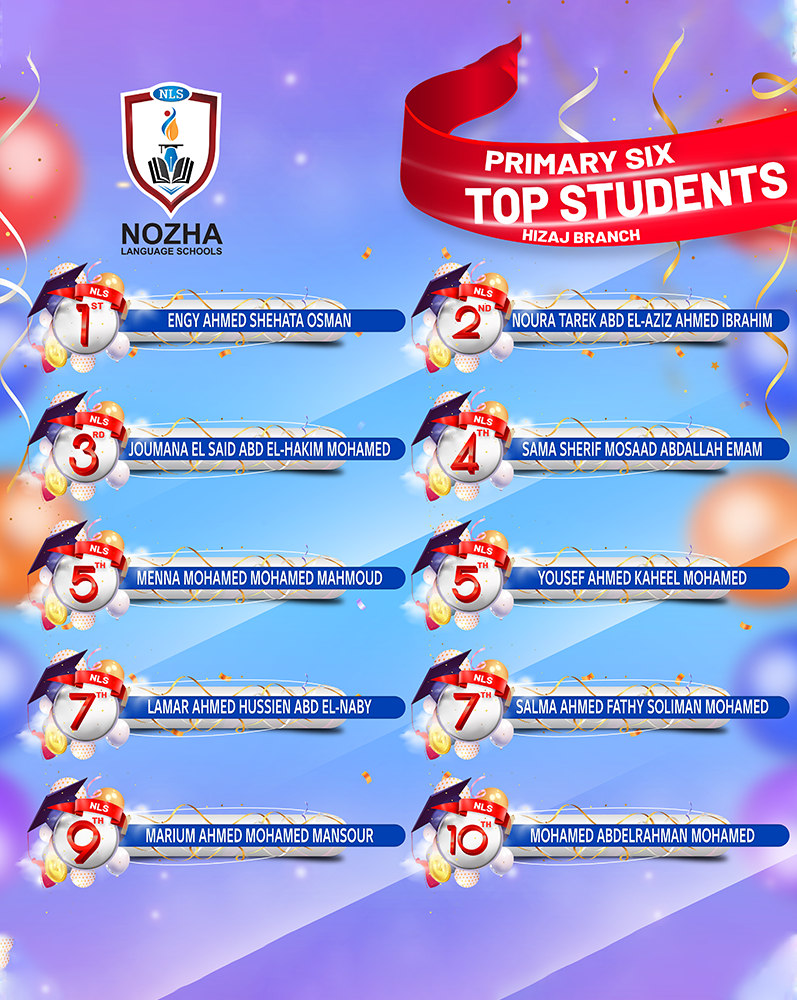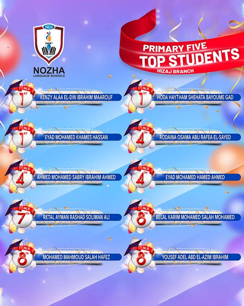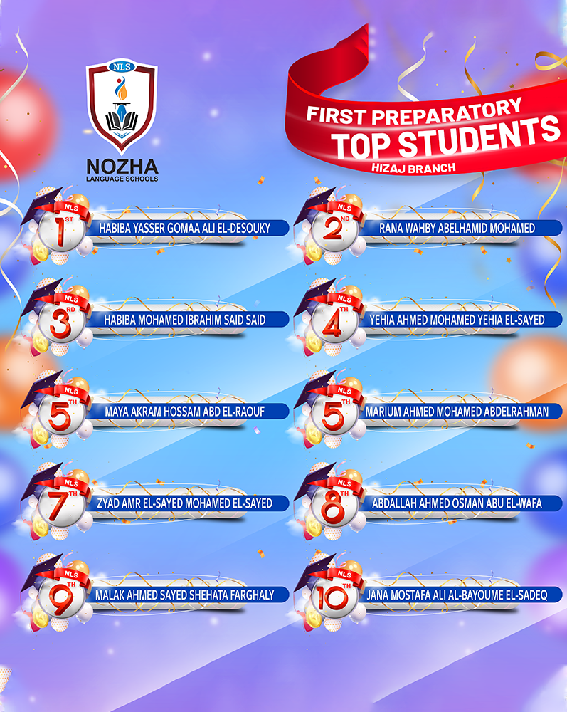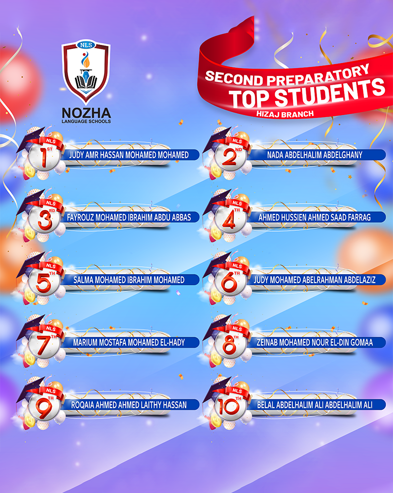 Nozha Language Schools Top Students 2021-2022 “The future belongs to those who believe in the beauty of their dreams.” ― Eleanor Roosevelt Nozha Language Schools congratulates our beloved ranked students for their marvellous efforts throughout the academic year 2021-2022 Karim El Shafie2022-08-24T18:04:53+02:00 Share This Story, Choose Your Platform! FacebookXRedditLinkedInWhatsAppTumblrPinterestVkXingEmail